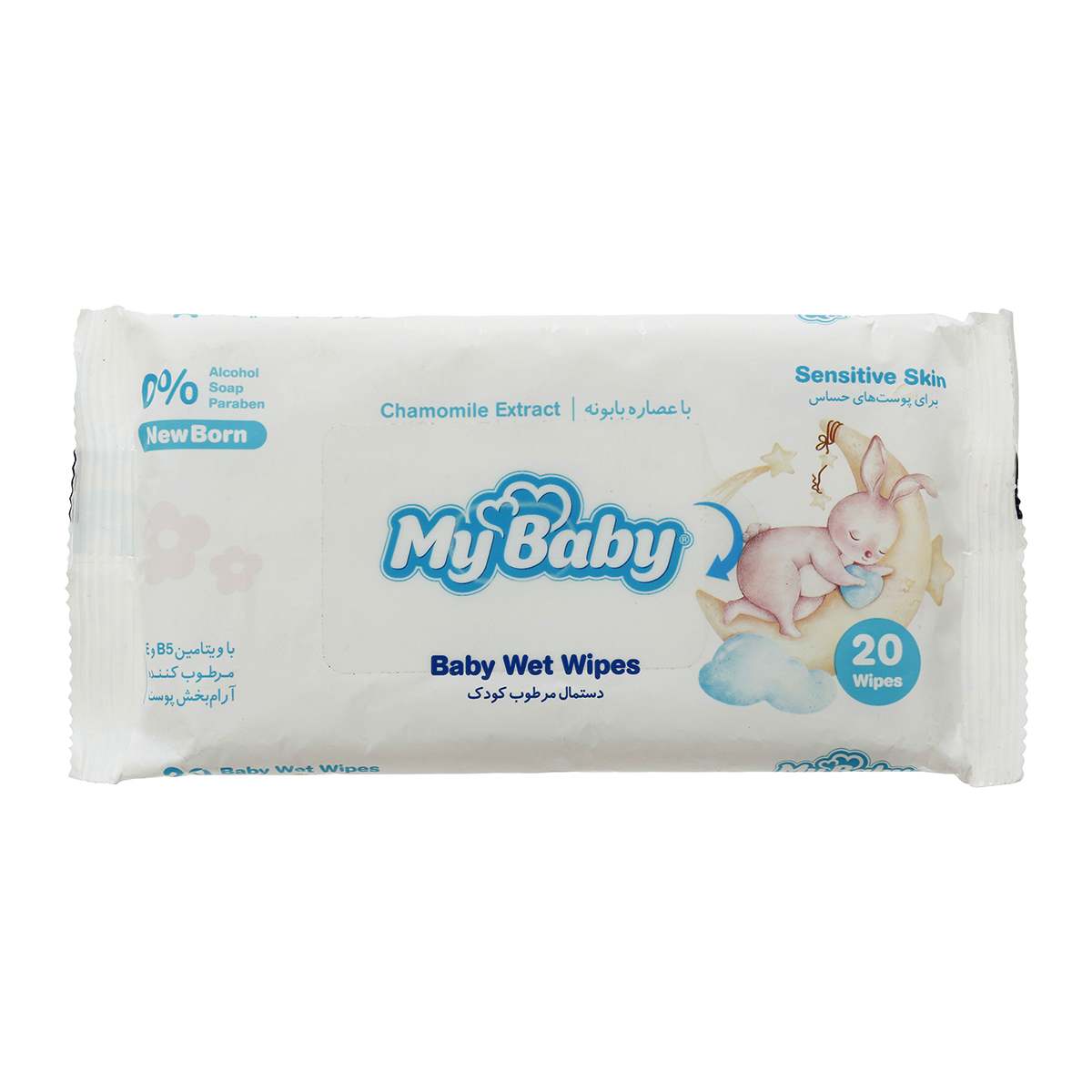 دستمال مرطوب کودک مای بیبی مناسب پوست های حساس بسته ۲۰ عددی